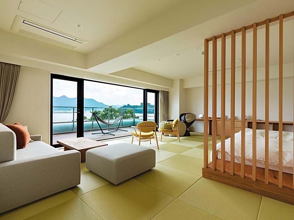 The spacious twin room provides air conditioning, tatami, a tea and coffee maker as well as a terrace with sea views. The unit offers 2 beds.